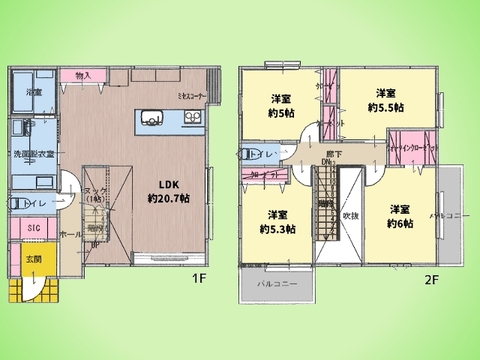 カースペース2台可(車種による) 床暖房 対面キッチン 食洗機 床下収納 太陽光パネル設置 全居室収納有 浴室窓有 シューズボックス トイレ2ヶ所 独立洗面化粧台 ウォークインクローゼット2ヶ所
