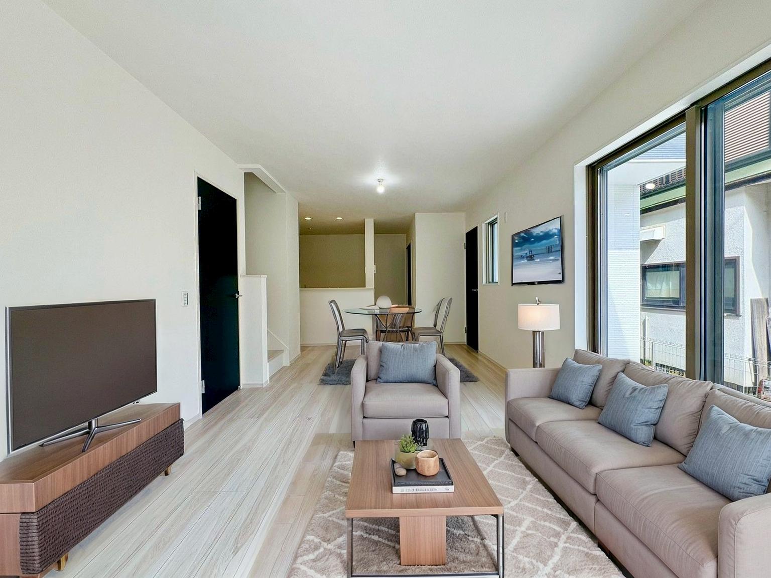 駐車スペースあり(車種による) 浴室乾燥機付きバスルーム 食洗機・浄水器一体型システムキッチン ハンドシャワー付洗面台 リビングイン階段 都市ガス
