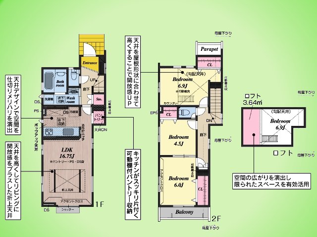 駐車スペースあり(車種による) 耐震構造 制震ダンパー搭載 浴室乾燥機付きバスルーム 食洗機付きシステムキッチン ロフト収納付き 都市ガス