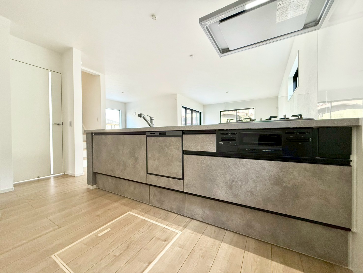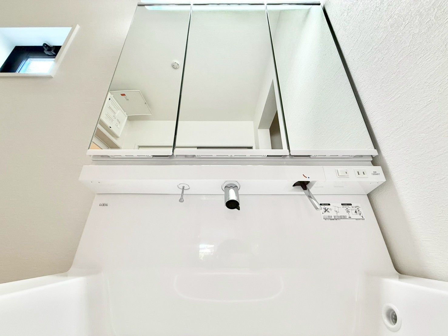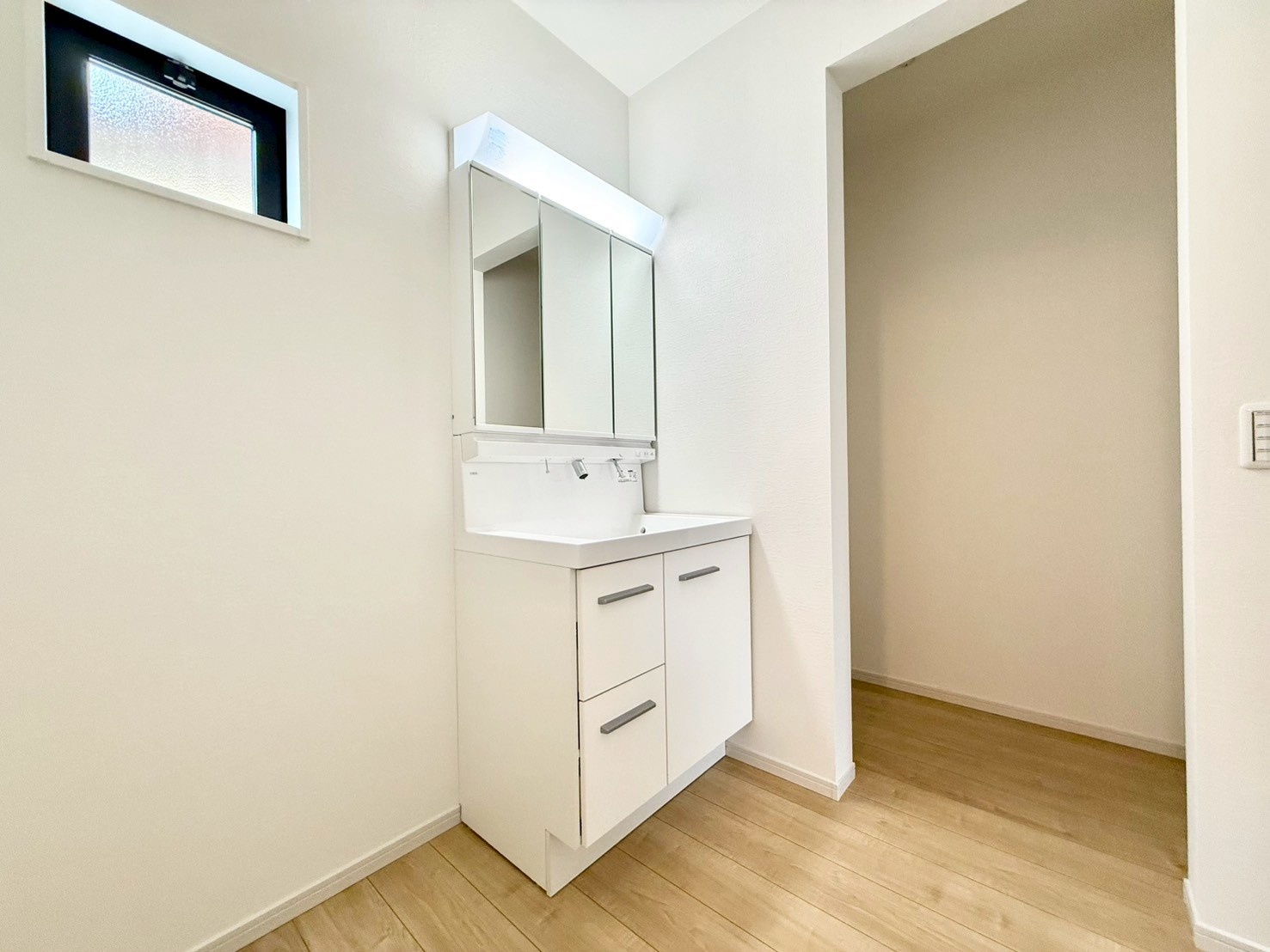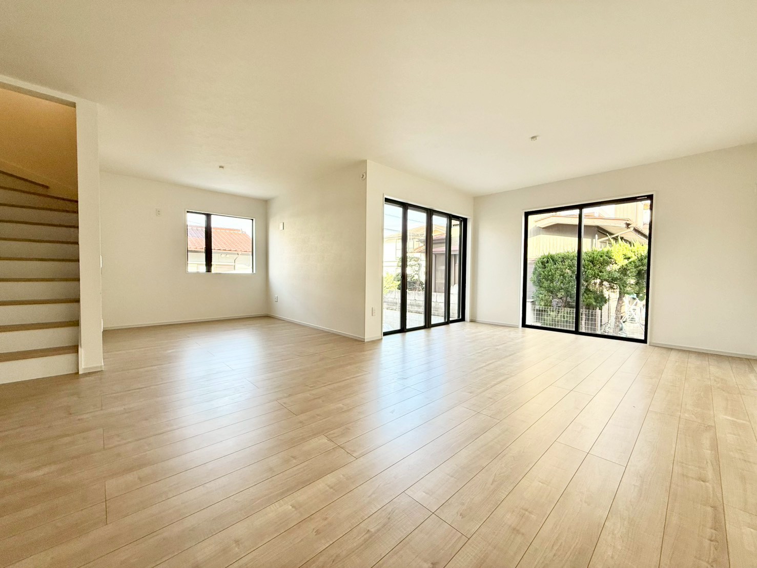 カースペース3台可(車種による) リネン庫 24時間換気 アクセントクロス 三面鏡付洗面化粧台 土間収納 手摺付階段 リビング床暖房 全室ペアガラス シャッター オープンキッチン キッチンパントリー