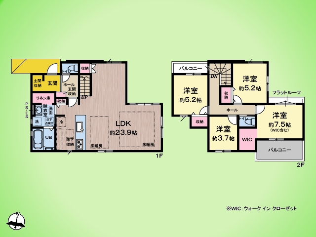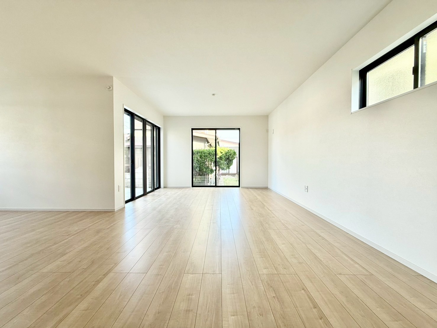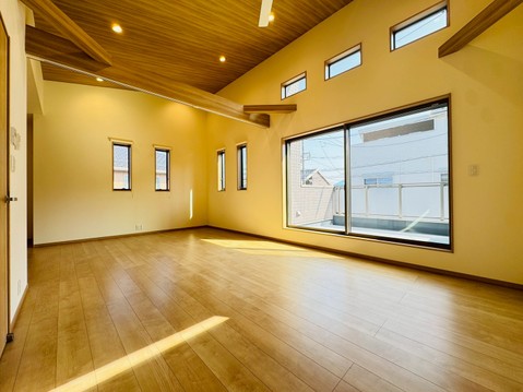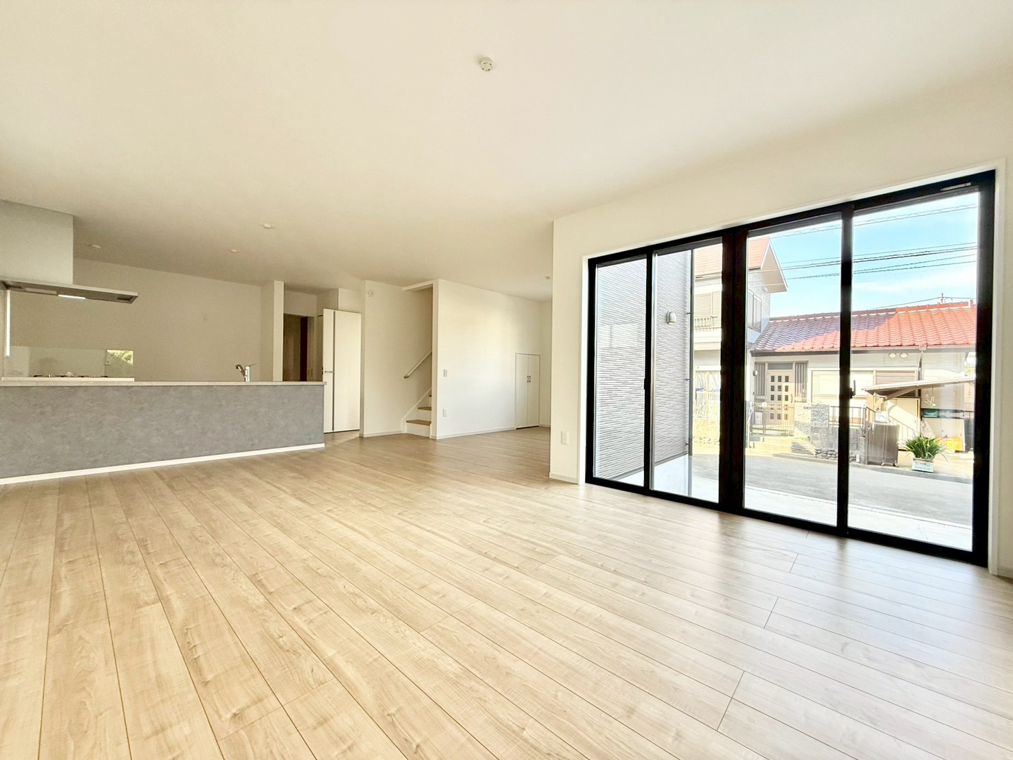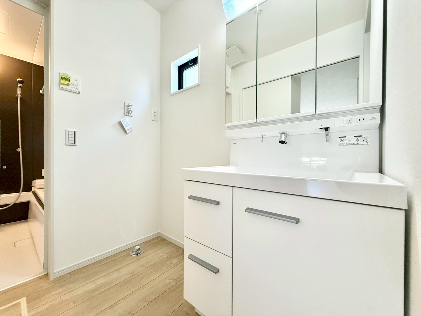 カースペース3台可(車種による) リネン庫 24時間換気 アクセントクロス 三面鏡付洗面化粧台 土間収納 手摺付階段 リビング床暖房 全室ペアガラス シャッター オープンキッチン キッチンパントリー