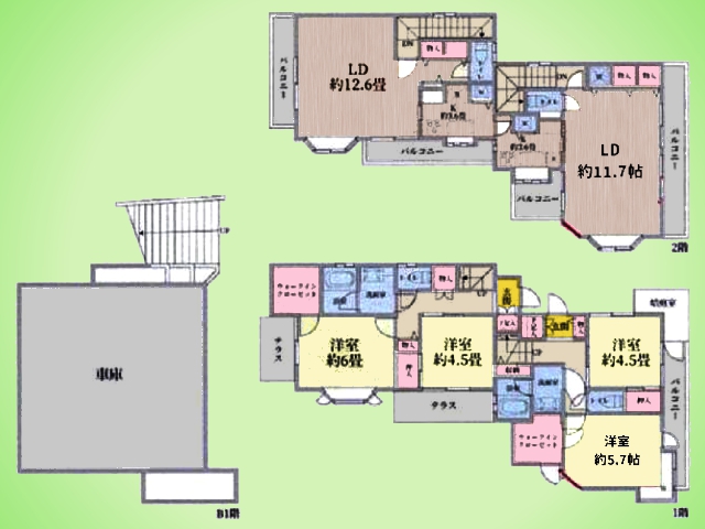 閑静な住宅街 温水洗浄便座 都市ガス エアコン インターネット対応 ウォークインクローゼット 各居室収納スペース付き 車庫 公園徒歩約7分 コンビニ・ドラッグストア徒歩約6分