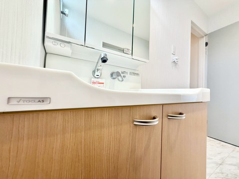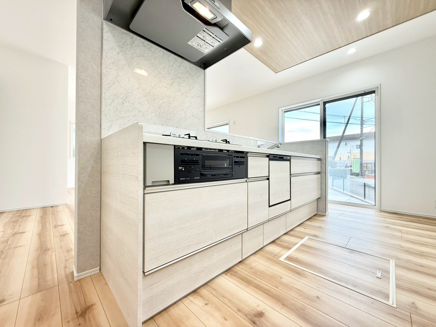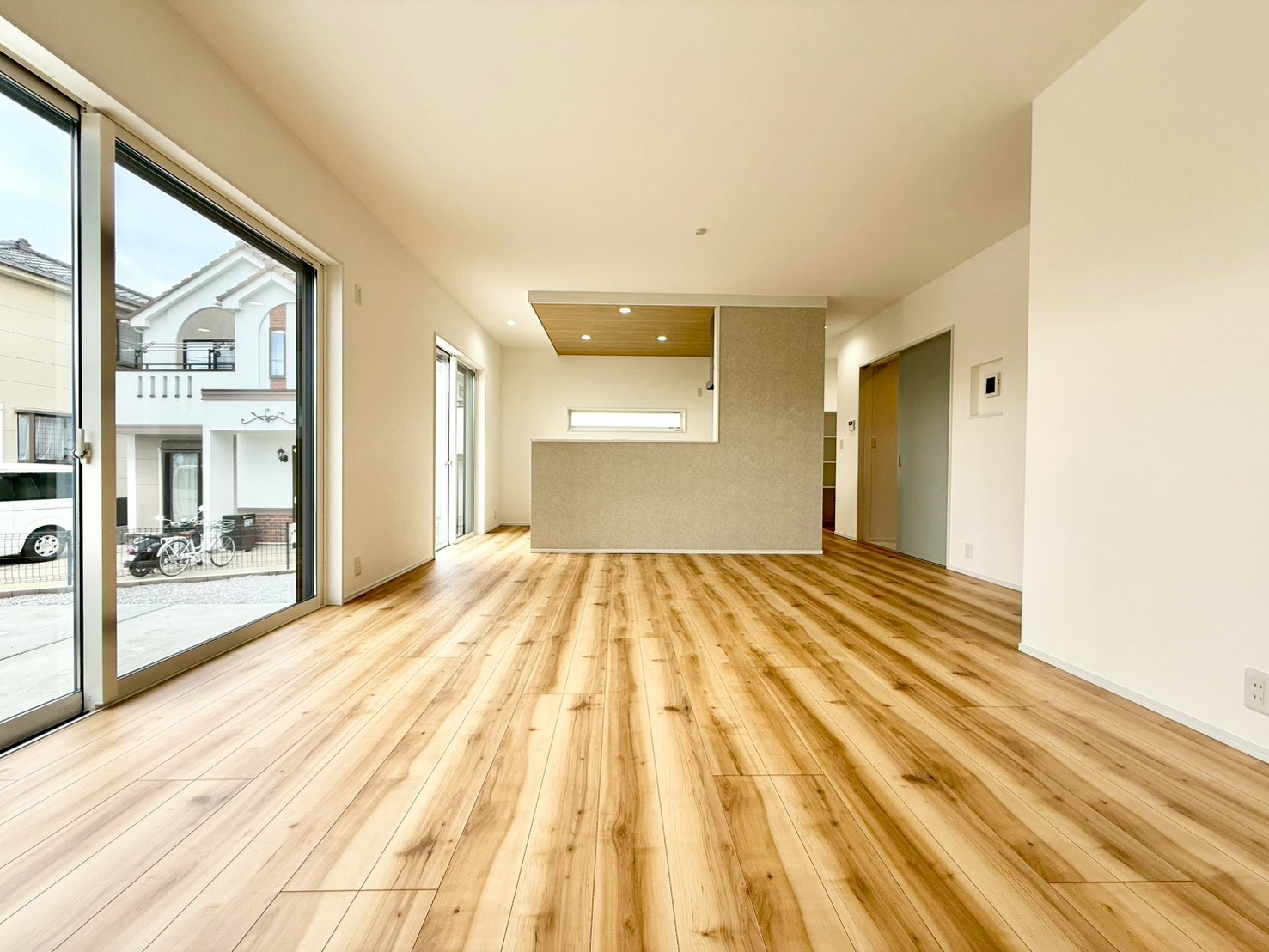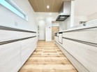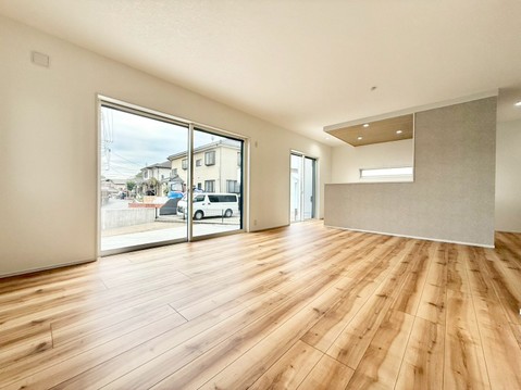 駐車スペース3台可(車種による) 完成済みにつき内覧・即時引渡し可能 浴室乾燥機付きバスルーム 食洗機・浄水器一体型システムキッチン シャワー付き洗面化粧台 都市ガス