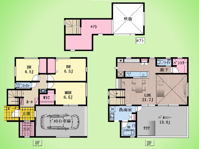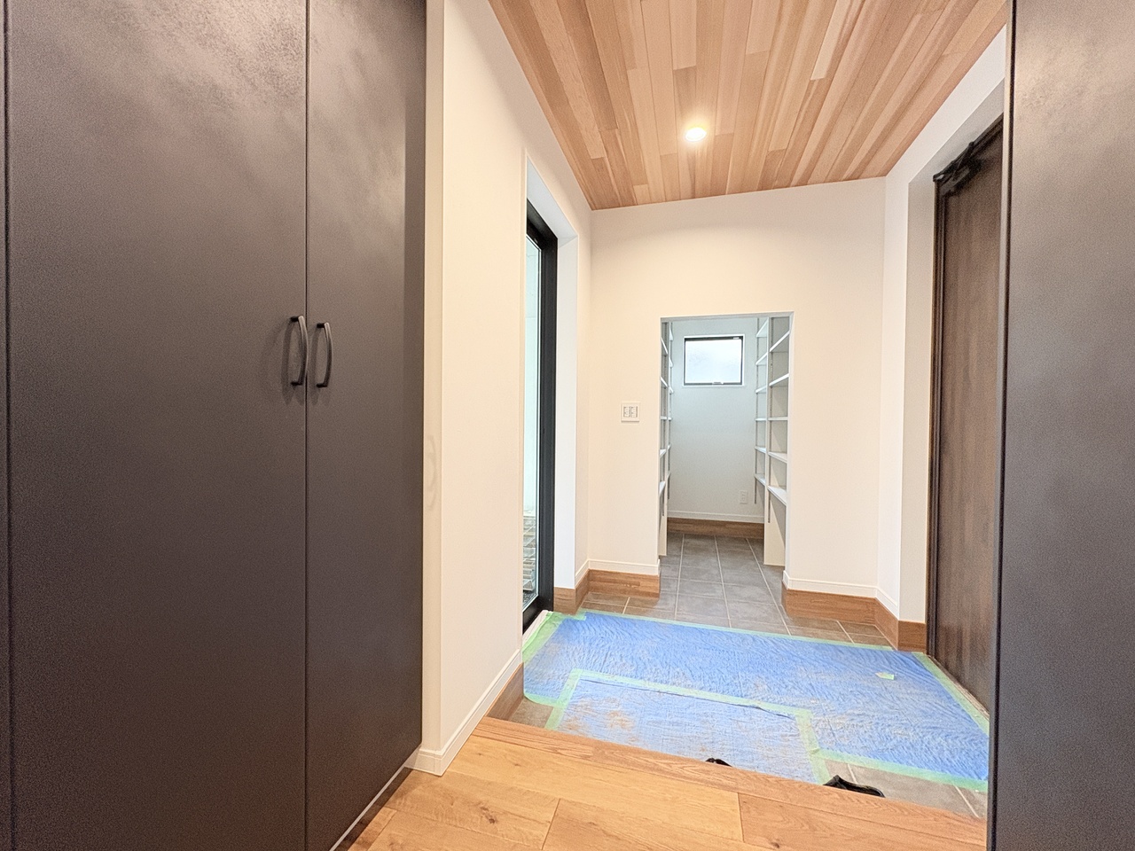 駐車スペース4台可(車種による) サウナ付きガレージハウス バルコニーにサウナがあります ヒュームドオークヘリンボーン貼り仕様