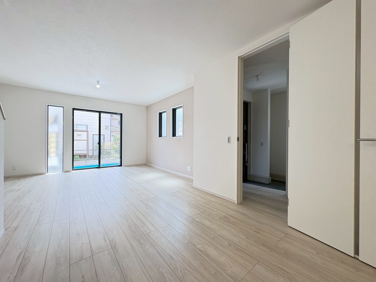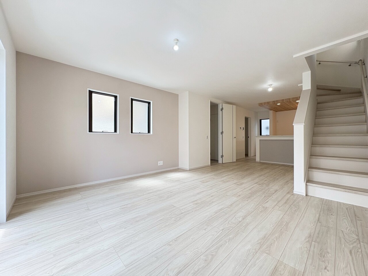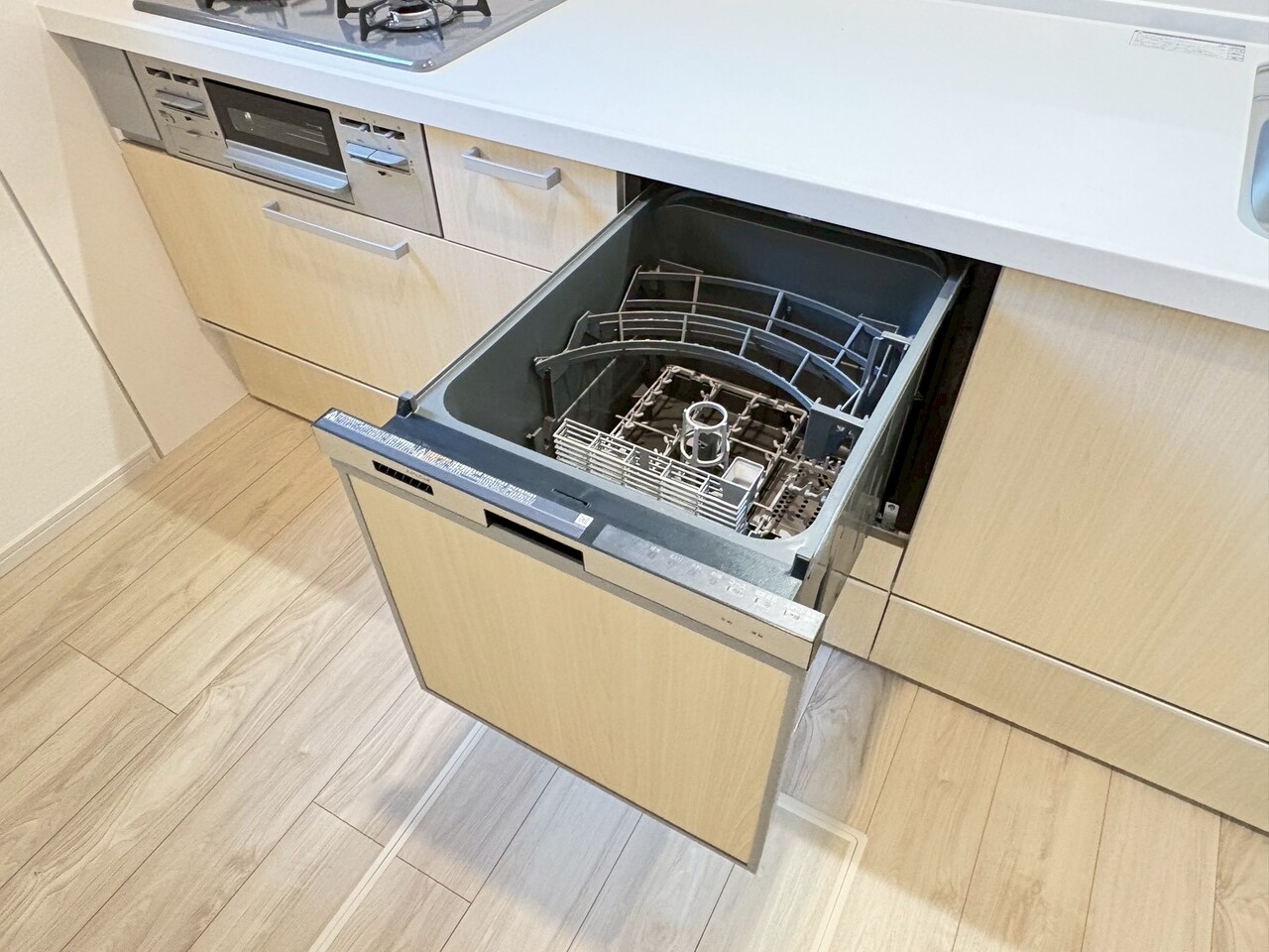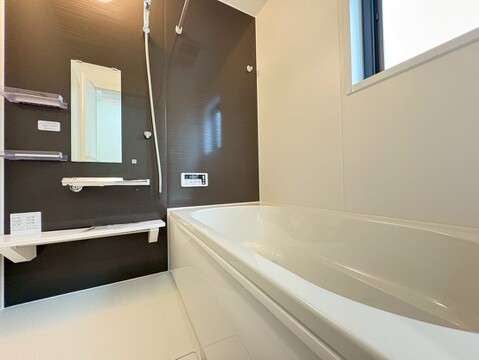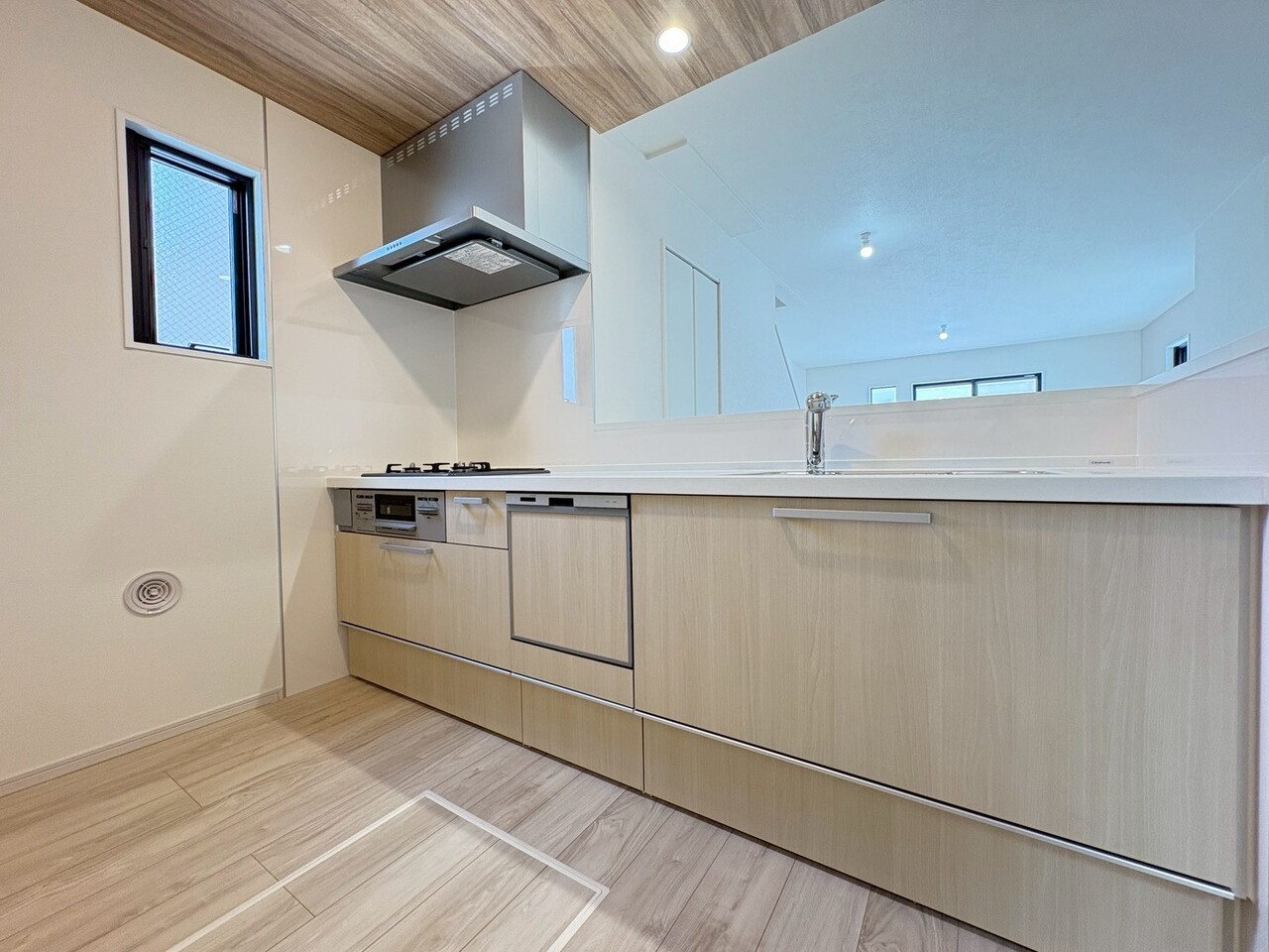 駐車スペース2台可(車種による) 完成済みにつき内覧・即時引渡し可能 浴室乾燥機付きバスルーム 食洗機・浄水器一体型システムキッチン ハンドシャワー付洗面台 都市ガス