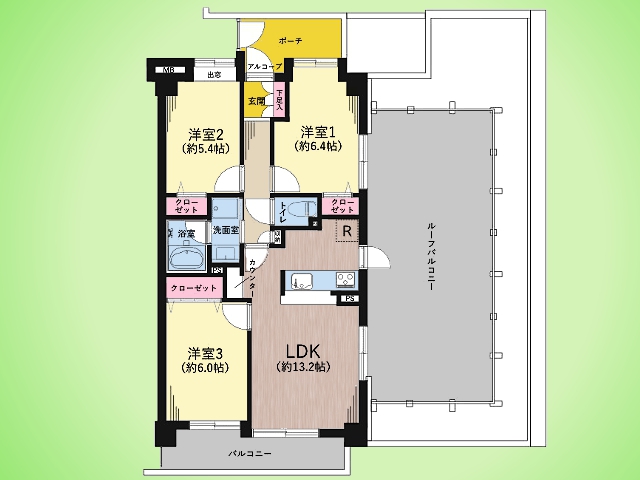 ペット飼育可(細則あり) 三方向角部屋 約35.20平米のルーフバルコニー付 5階南東向き 日照・通風・眺望良好 温水洗浄便座 浴室乾燥機 浄水器 食洗機 フローリング オートロック 宅配ボックス